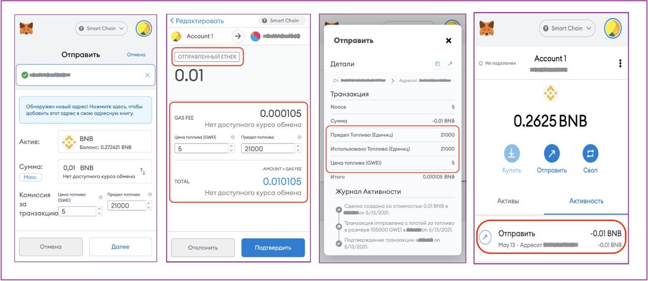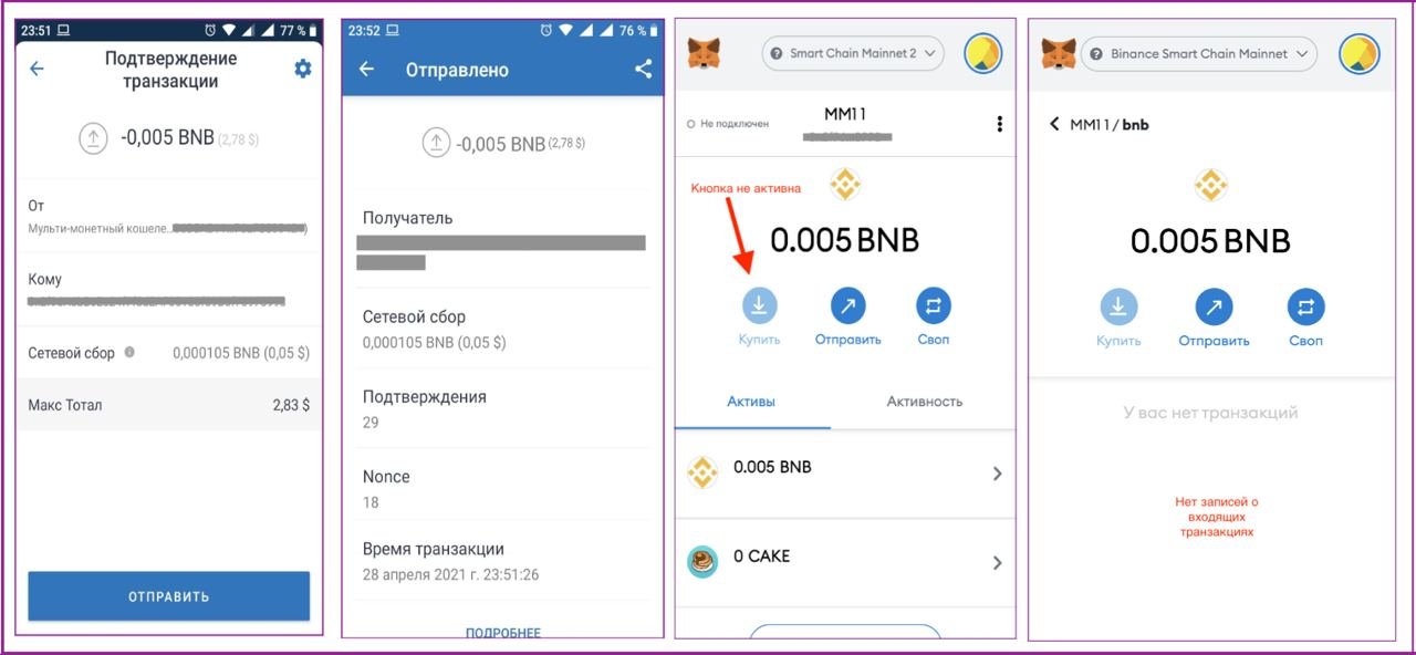 - отправляю BNB, а кошелёк показывает тикер ETHER (второй скрин);
