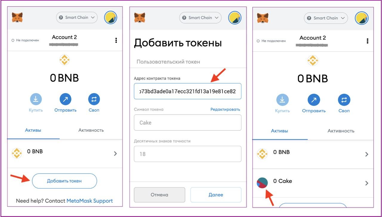 Токены могут «пропадать». CAKE отображаются в кошельке, а спустя время можно зайти в кошелёк и не увидеть их. Сначала это меня испугало ? Но после повторного добавления токена – он появляется и баланс на нём сохранён. Помня о том, что фактически токены хранятся на блокчейне, а не в кошельке, делаю вывод, что это просто баг с отображением и фактически средства никуда не деваются.