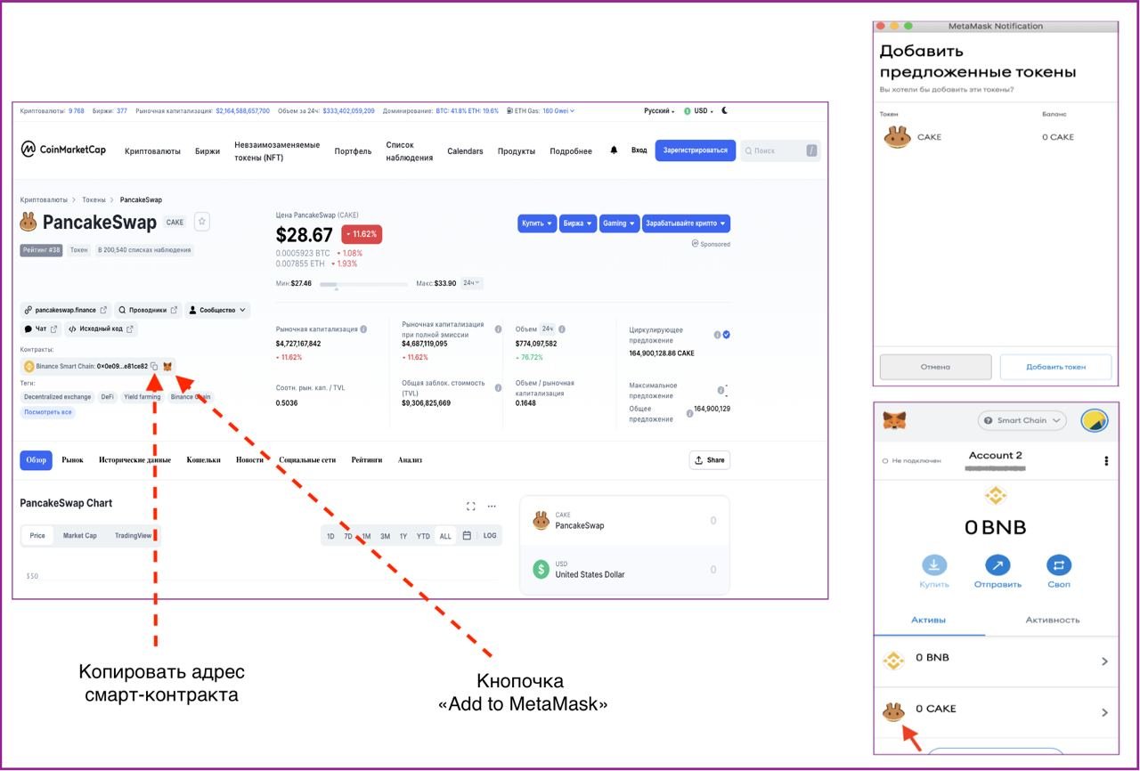 Адрес смарт-контракта можно взять на coinmarketcap.com. Там же на капе можно нажать кнопочку «Add to MetaMask», подтвердить в кошельке операцию и токен автоматически добавится в кошелёк:![]()