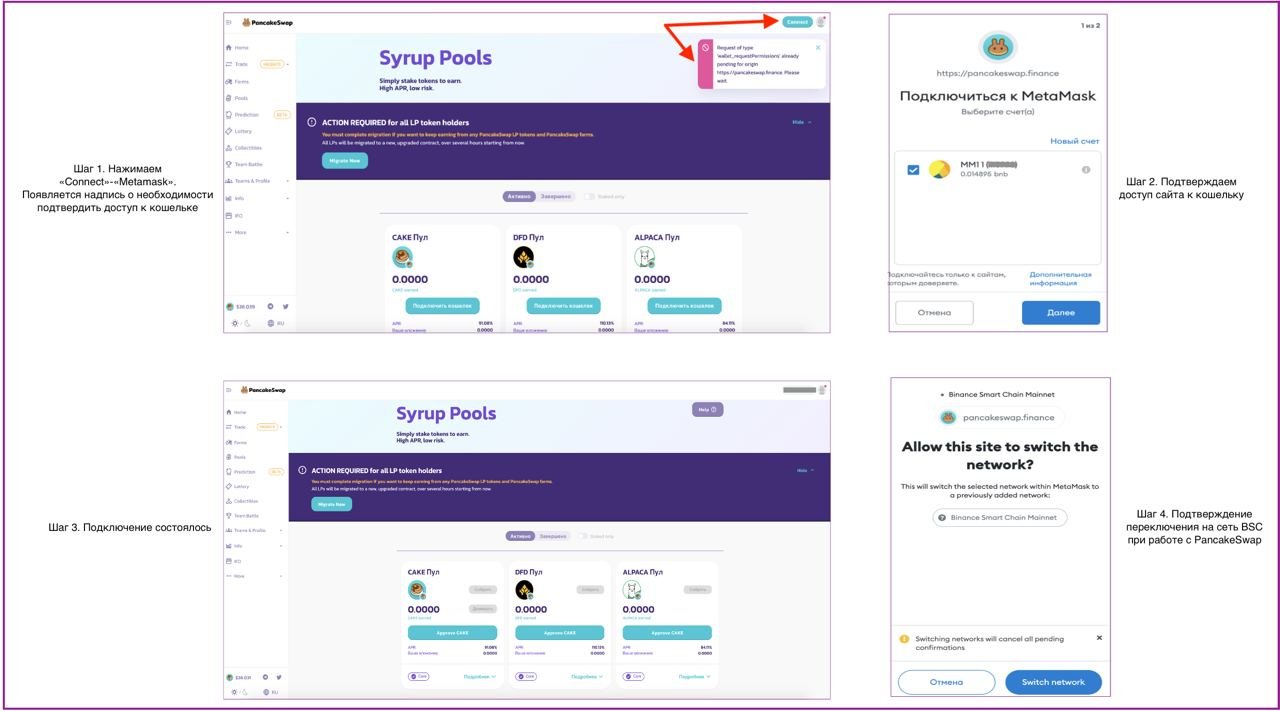 МетаМаск можно подключить, наверное, к большинству существующих DeFi платформ. Протестирую на хорошо знакомом PancakeSwap. Подробнее о работе на Pancake сделал серию статей, которая начинается с «PancakeSwap. Обмен, пулы ликвидности и фарминг. Часть 1».