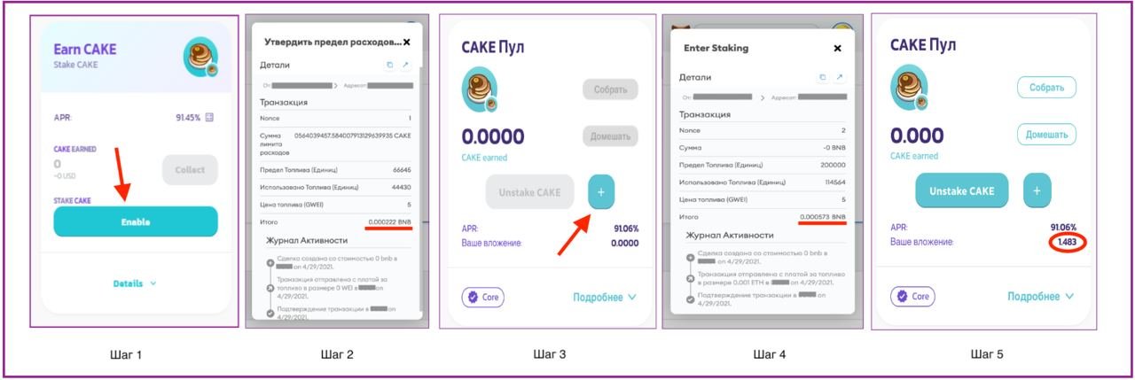 29.04.2021 застейкал в сиропе 1,483 CAKE. Подтверждение и ввод стоили мне 0,000795 BNB или примерно 0,44 цента. На момент публикации статьи CAKE стейкаются уже 16 дней и за это время доход составил 0,060 CAKE.