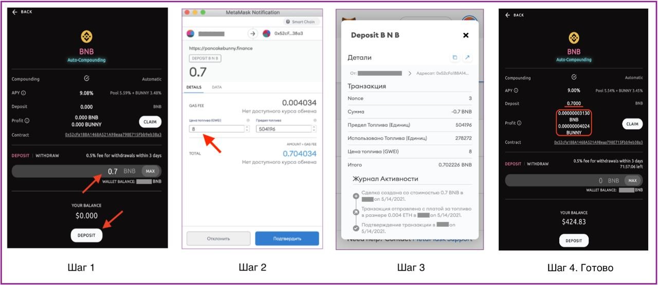 Подождал денёк и решил рискнуть покрупнее, 14.05.2021 внёс 0,7 BNB ? Комиссия за ввод составила 0,002226 BNB или 1,25 доллара. В те дни сеть BSC испытывала перегрузки, и транзакция могла проходить долго или даже зависнуть. Чтобы избежать этого, я вручную повышал стоимость за единицу газа до 7-8 gweiза единицу (Рис 5, Шаг 2). С такой ценой транзакции проходили моментально.![]()