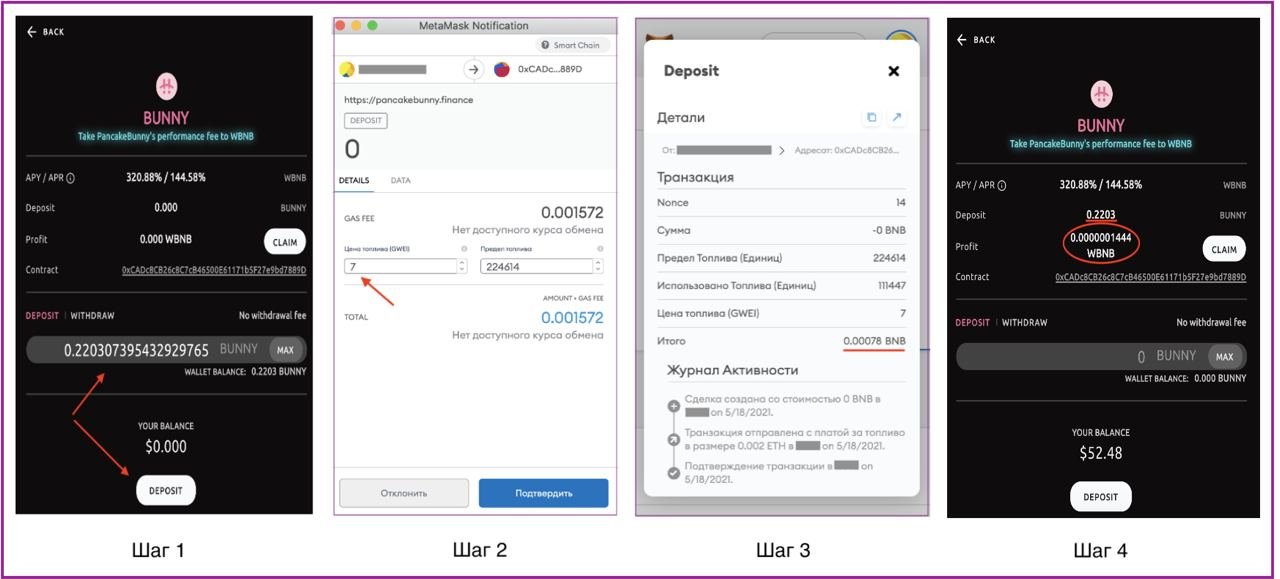 Награда начисляется в реальном времени. Буквально за пару минут после вода средств накапали первые миллионные доли BNB и BUNNY (Рис 4., Шаг 4).