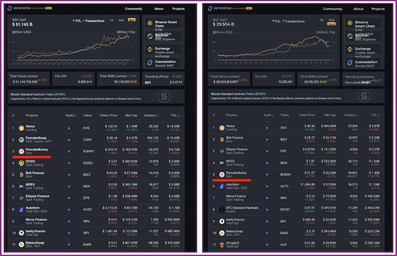 На момент начала создания статьи проект занимал 355 место по уровню капитализации в рейтинге coinmarketcap.com и третье место по объёму заблокированных средств среди всех DeFi, работающих на BSC. После обвала рынка на этой неделе он сместился на 702 и пятое места соответственно:![]()