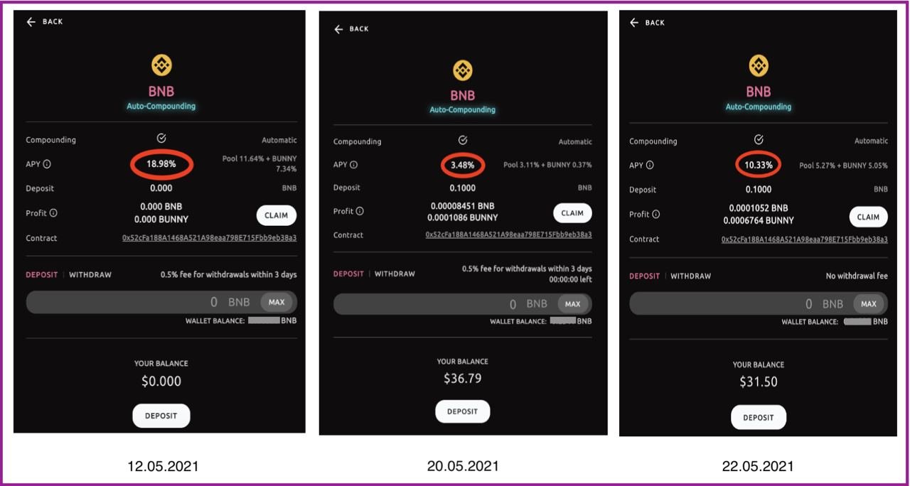 Вознаграждение начисляется в двух валютах: BNB и BUNNY. На скрине в строчке APY видна пропорция, например, на правом скрине общий APY равен 10,33% и состоит из двух частей: 5,27% в BNB и 5,05% в BUNNY. Перед вводом средств в пул есть предупреждение, что если выводить раньше истечения трёх суток с момента внесения, то придётся уплатить комиссию площадке в размере 0,5% от суммы.