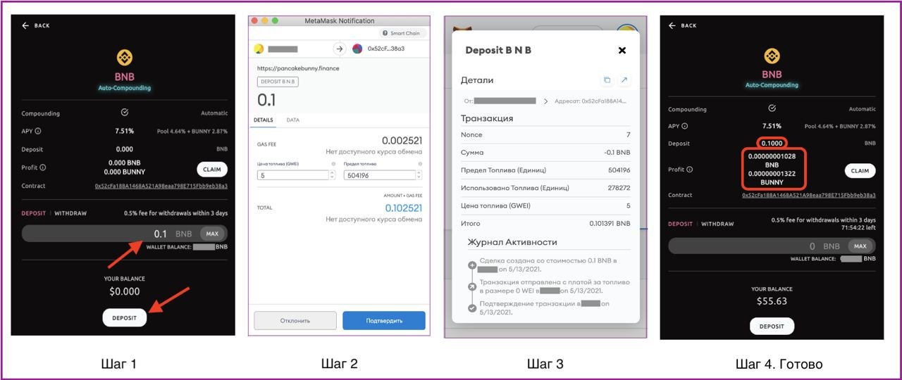 Если я правильно понял, PancakeBunny является автоматическим компаундером, реинвестирует средства самостоятельно и даст доход по ставке APY. Буду наблюдать за начислением наград и посмотрим, что получится по факту.