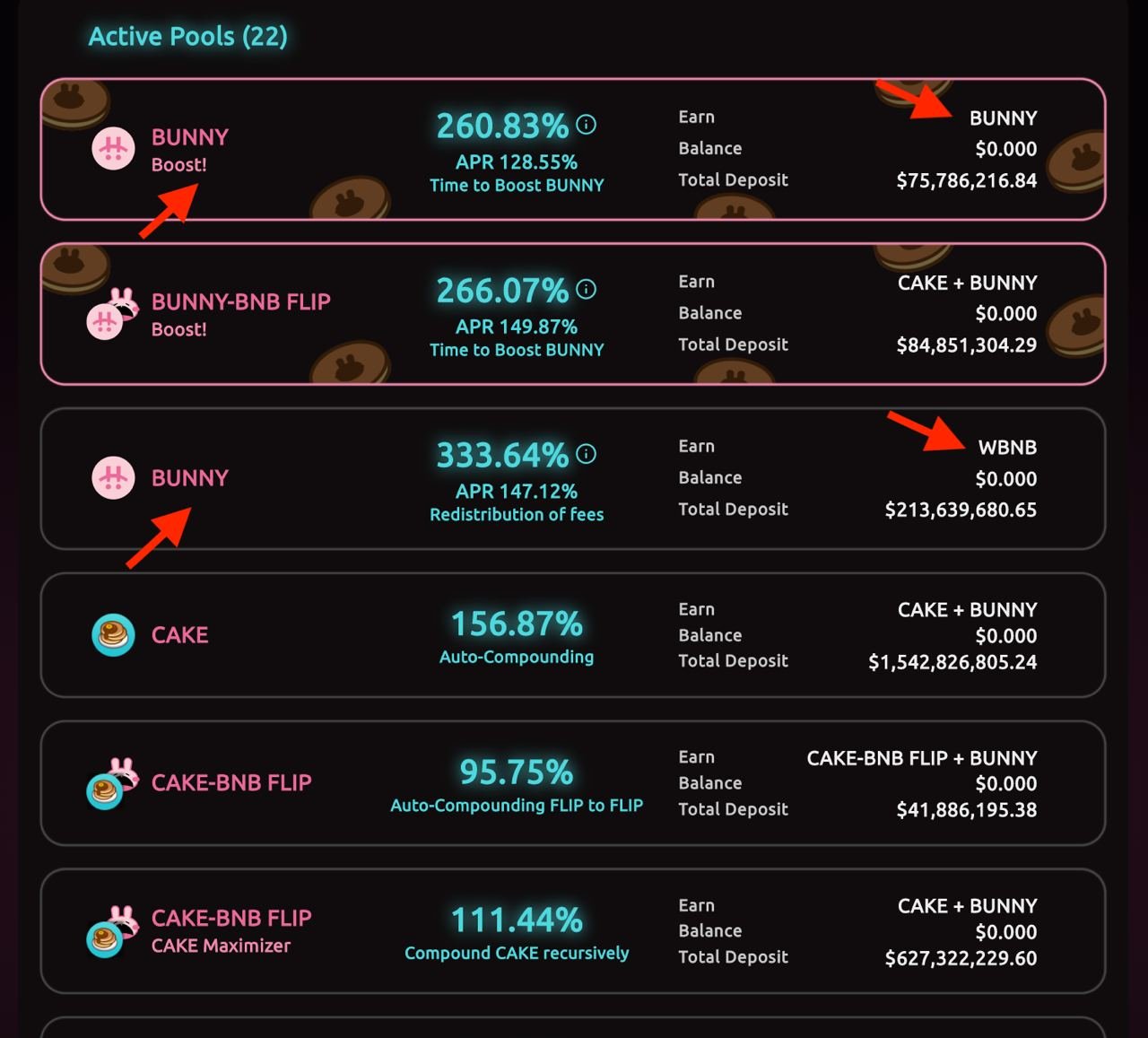 Есть два пула для стейкинга BUNNY. В одном из них награда выплачивается в BUNNY, а в другом застейканные BUNNY фармят WBNB:![]()