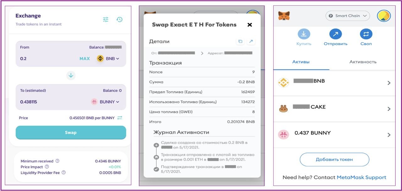 0,2 BNB поменял на 0,437 BUNNY. При пересчёте на доллары курс составил примерно 253 бакса за 1 BUNNY, что соответствовало курсу указанному на coinmarketcap. Комиссия составила 0,001074 BNB или 0,58 доллара.