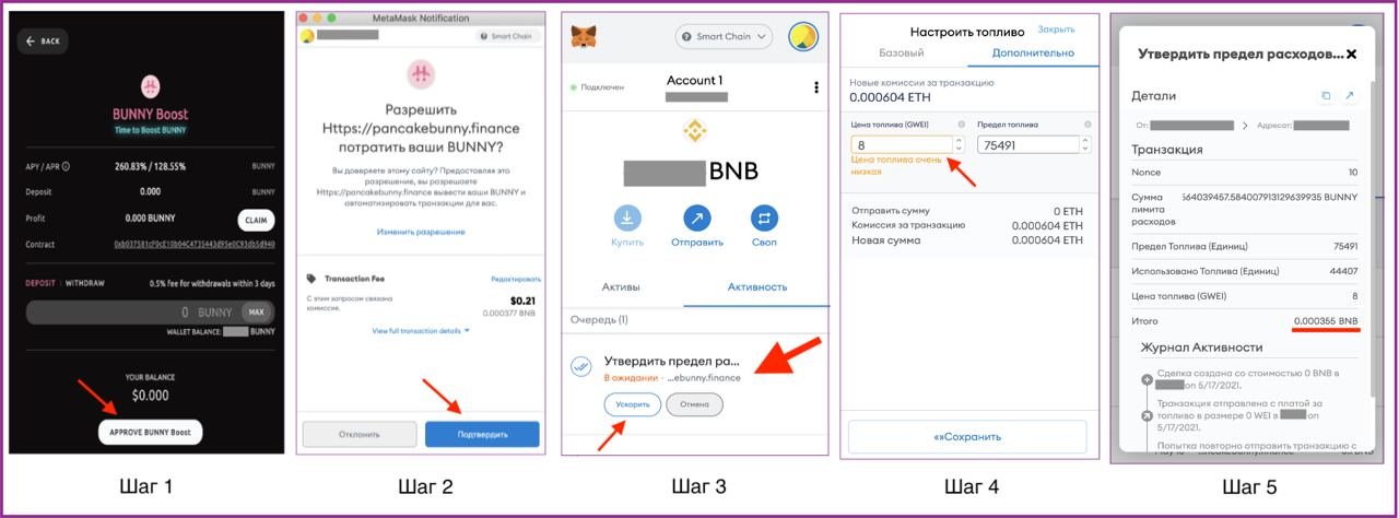 Теперь вношу BUNNY в пул. Сначала необходимо подтвердить доступ смарт-контракта к токенам BUNNY в кошельке. На этом этапе столкнулся с «застрявшей» транзакцией – делал по цене 5 гвей за единицу, и она застряла. Пришлось ускорить её, увеличив цену за единицу до 8 гвей. После этого транзакция прошла за несколько секунд и подтверждение состоялось:![]()