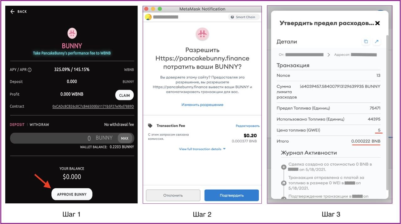 Снова подтверждаю доступ смарт-контракта к токенам BUNNY в кошельке несмотря на то, что делал это ранее – для каждого пула своё подтверждение. Подтверждаю по стандартной цене в 5 гвей за единицу.