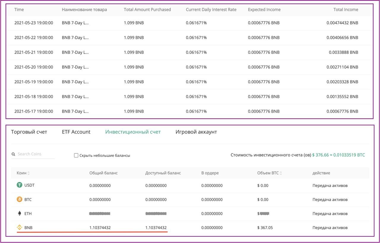 С 17.05.2021 ежедневно начислялись награды, за 7 дней я заработал 0,00474432 BNB. В пересчёте на проценты доход составил 22,5% годовых, что соответствует APY, заявленному площадкой. Мои средства и начисленная награда автоматически вывелись на «Инвестиционный счёт» 24.05.2021: