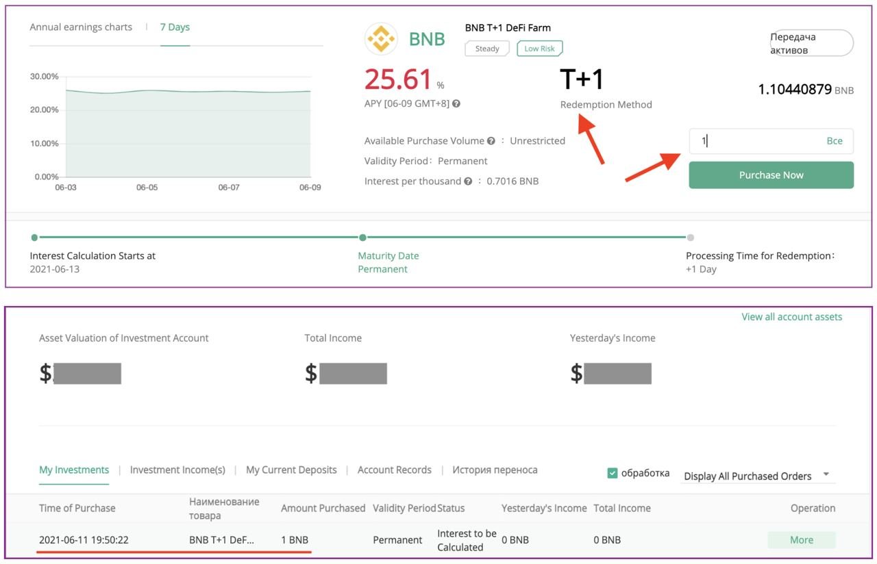 Между BNB 7-Day Lockup и BNB 30-Day Lockup выбираю первый вариант – процент примерно одинаковый, зато срок блокировки намного меньше. Вкладка продукта выглядит следующим образом: