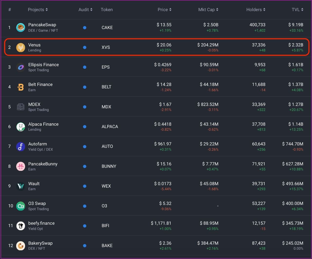 По данным defistation, объём заблокированных средств на Venus составляет 2,3 млрд долларов и это второе место среди всех DeFi площадок, работающих на BSC: