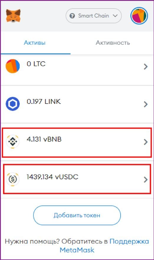 Обозначаются, как и оригинальная валюта, но с приставкой «v», например, BNB – vBNB, USDC – vUSDC и т.д. Физически в кошельке есть функция обмена и отправки этих токенов, но при попытки сделать это он или пишет ошибки или предлагает какие-то странные курсы. Делать этого не будем – если их вывести или обменять, то теоретически потеряем доступ и не сможем вывести реальные активы из платформы.