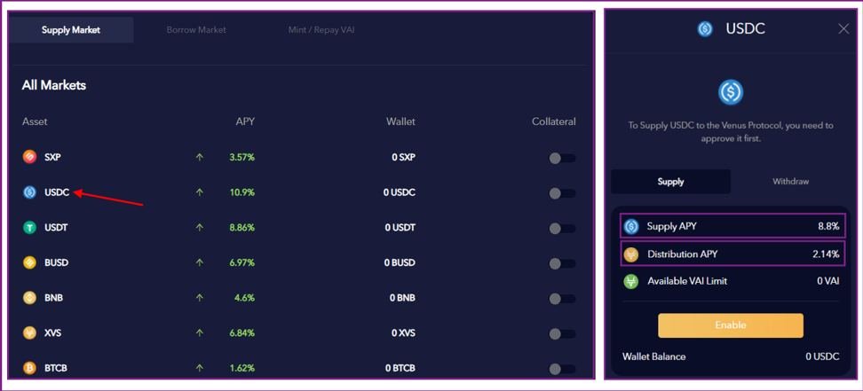 Список депозитных продуктов находится во вкладке Supply Market. Значение APY – динамическая величина, которая меняется в режиме реального времени в зависимости от соотношения количества заёмщиков/поставщиком на рынке. APY состоит из двух значений: собственная доходность актива (стейкинг) и доход от распределения XVS токенов. Если нажать на интересующий актив, то можем увидеть подробности.