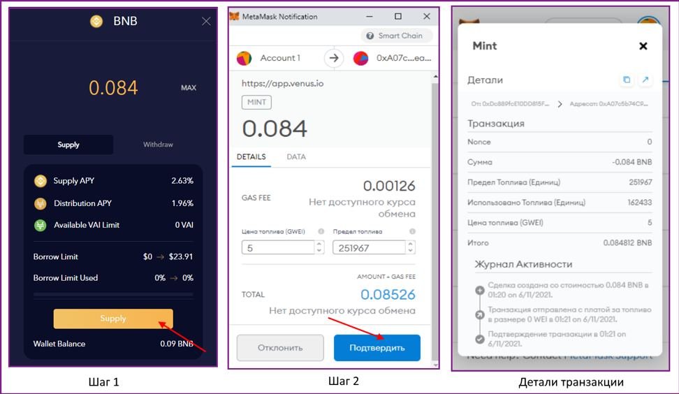 Подключившись, приступим к изучению возможностей Venus. На площадке доступны следующие инструменты: депозиты (supply), займы (borrow), создание (mint) токенов VAI и Vault, где с помощью VAI можно фармить XVS токены. Начнём с теста депозитов.