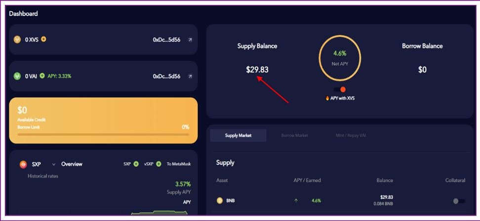 Текущий APY в пуле составляет 4.6% годовых, состоящий из Supply APY – 2.63% и Distribution APY – 1.96%. Ползунок «APY with XVS» в зависимости от положения отображает или общий APY или только Supply APY.Вознаграждение начисляется в режиме реального времени и в ближайшее время первые проценты в BNB и XVS должны поступить на баланс.