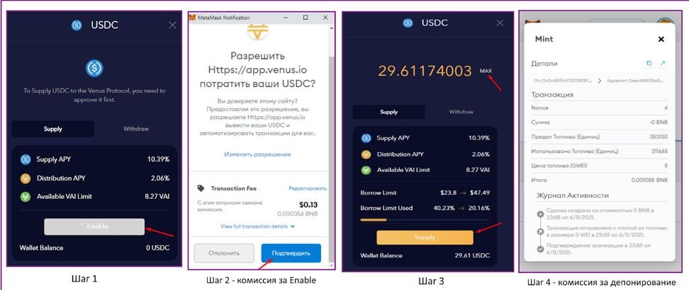 В случае с USDC, перед депонированием сначала надо подтвердить доступ смарт-контракта к активу в кошельке, нажав кнопку «Enable». Комиссия за эннэйбл составила 0,000356 BNB или 0,13 долларов. Дальше делаем шаги аналогично депозиту BNB и вносим средства.