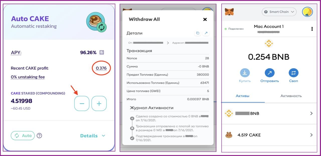 16.07.2021 вывожу средства из пула. Нажимаю значок «-», подтверждаю транзакцию и 4,51998 CAKEвыведены в кошелёк. Комиссия составила 0,000317 BNB или 0,1 доллара.