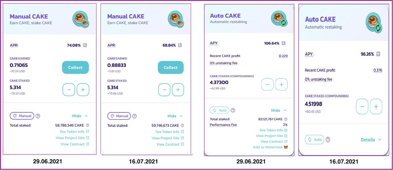 Справедливости ради, отмечу, что доход в автоматическом пуле всё же выше, чем в ручном, то есть автокомпаундирование работает на пользу. Наблюдая за пулом и отмечая нестыковку заявленного и фактического APY, я решил сравнить процент дохода в автоматическом и ручном пулах за одинаковый момент времени. 29.06.2021 сделал скрин обоих пулов с заложенными туда средствами и 16.07.2021 сделал ещё один скрин — получился временной срез за 17 дней: