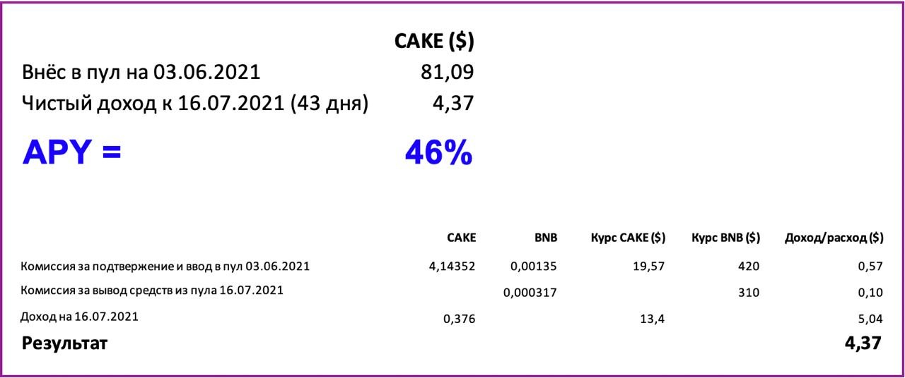 Фактический APY при расчёте в CAKE составил 77% годовых. После заявленных 125% и 96% годовых на момент ввода/вывода средств, такое значение удивляет. Находил объяснения в стиле того, что «заявленный размер APY был бы если бы, средства лежали год и процент наград не менялся бы, но так как он меняется то…». Если честно мой гуманитарный мозг так и не понял этих хитросплетений, и правда это или «маркетинговый» ход для меня этот вопрос остался открытым. Факт в том, что за 43 дня накапало тортиков из расчёта 77% годовых, а не из расчёта заявленных 96% и тем более 125% годовых.
