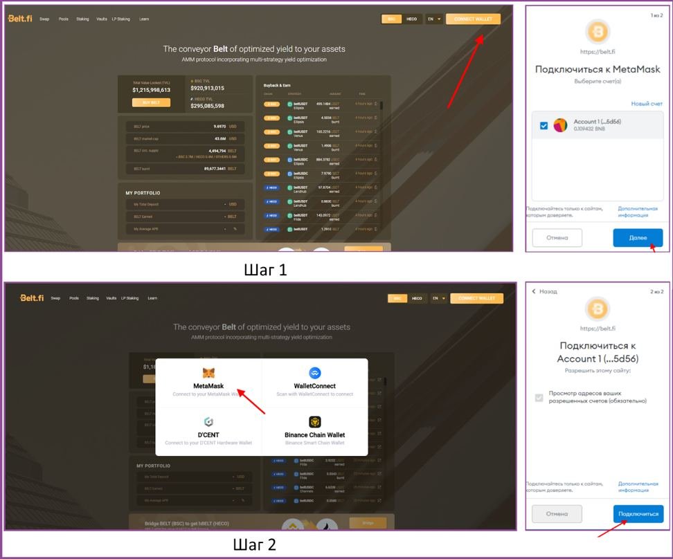 hBELT. Площадка работает не только на BSC, но и на HECO – блокчейн, созданный биржей Huobi. 25% от общей эмиссии токенов BELT переведено на HECO в виде токена hBELT, который можно в любое время обменять на оригинальный BELT в соотношении 1:1. На главной странице сайта можно переключать сети BSC или HECO, каждой из которых соответствуют свои пулы с разной доходностью. Поскольку нас интересует BSC, то тестировать будем работу на ней.