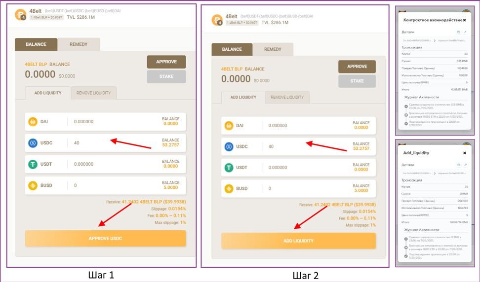 Сначала вносим стейблы в пул, тем самым предоставляя ликвидность и создавая LP-токен. Предоставленную ликвидность платформа использует для работы обменного пула и для вложения в другие BSC платформы, согласно своим стратегиям. Таким образом, поставщики ликвидности получают награды в виде части торговых комиссий пула и проценты от инвестиций в другие платформы. Награды начисляются в виде роста курсовой стоимости LP-токена. В том разделе сайта после создания, LP-токены можно дополнительно вложить в «стейк» и фармить BELT.