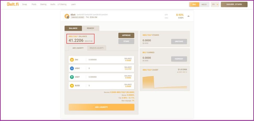?Если в кошельке есть стейблкоины, поддерживаемые пулом, то Belt отобразит их баланс и автоматически подставит сумму к выбору в форму, в нашем случае это токен BUSD.