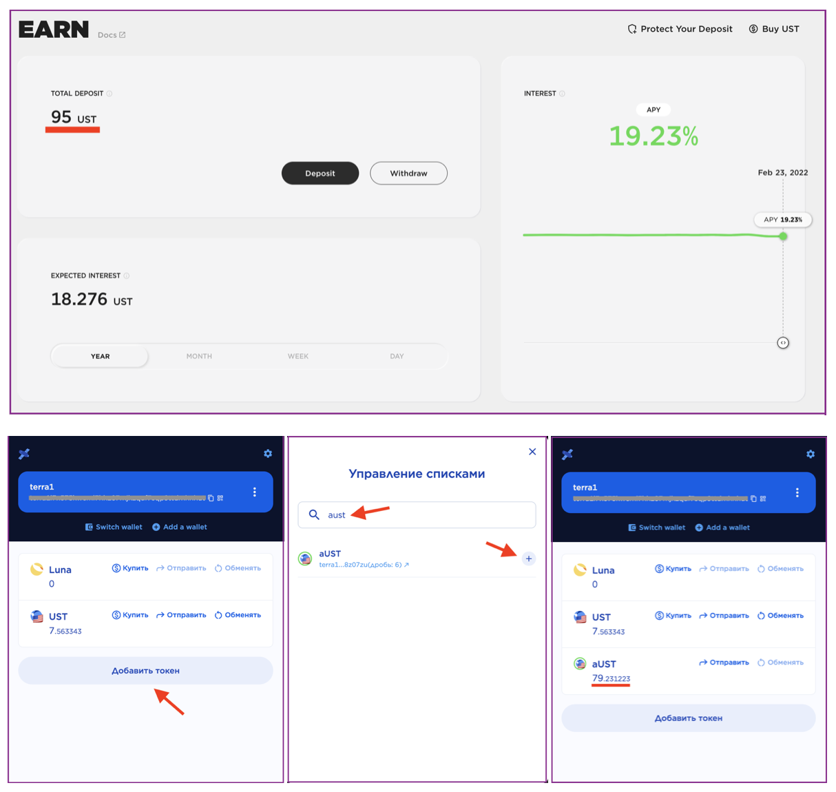 23 февраля ввёл 95 UST, комиссия за транзакцию составила 0,25 UST. В подтверждение того, что я внёс средства в пул, площадка выдала мне 79,231223 aUST. Чтобы токен отобразился в кошельке, его надо «добавить» вручную: