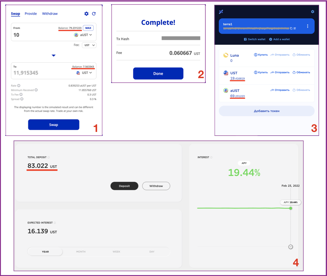 Итак, после манипуляций у меня по факту на вечер 23 февраля осталось задепонированными 83,022 UST. Понаблюдаю за ними соответствует ли доход заявленному проценту и добавлю коммент к статье.