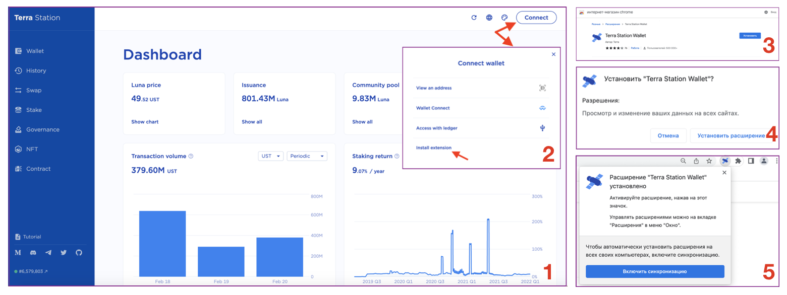Устанавливаю кошелёк Terra Station. Он разработан командой Terraform Labs, поэтому можно считать его официальным кошельком экосистемы Terra. Он устанавливается в качестве расширение в Chrome, которое скачиваю с официального сайта Terra Station.