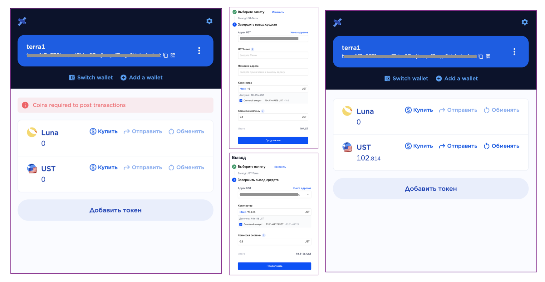 Ввёл примерно 102 UST двумя транзакциями, чтобы не рисковать на незнакомом блокчейне. Комиссия за транзакцию в Terra составляет 0,8 UST.