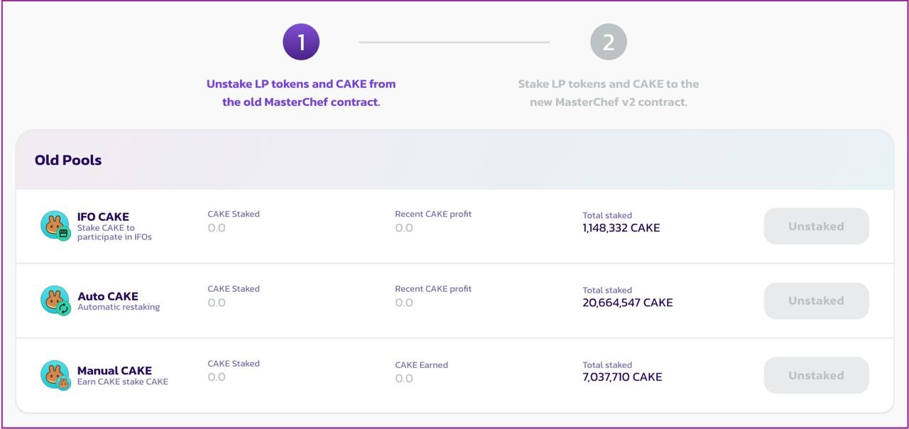 В середине апреля PancakeSwap что-то там обновил у себя и старые пулы по стейкингу CAKE перестали работать. Чтобы забрать токены из старого нерабочего пула, необходимо перейти по ссылке https://pancakeswap.finance/migration. Эту ссылку также можно найти на официальном сайте проекта и в официальном русскоязычном Телеграм-канале. Вкладка со старыми пулами выглядит вот так: