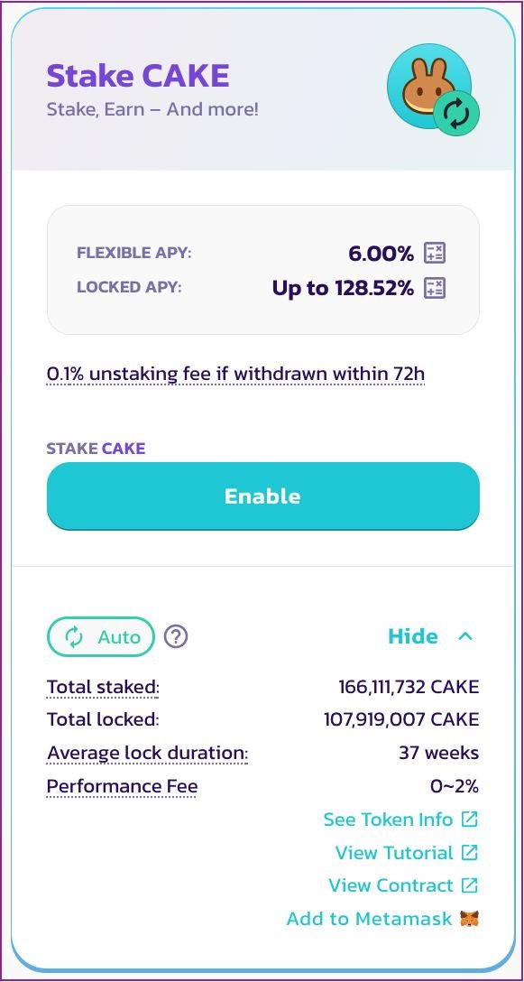 - на PancakeSwap доход составил 0,04263 CAKE или 16% годовых, за примерно 10 дней стейкинга, что вполне соответствует заявленному. Когда подойдёт срок разблокировки, проверю ещё раз процент и выложу комментом к статье.