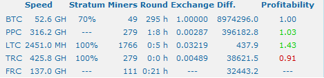 bitok Posted 29 Apr 2013, 08:02 Posted 29 Apr 2013, 08:02 а на чем больше заработать? курс то наверное разный? вот скажем пул 50BTC вроде не плохой а общая скорость всего 11 тыс. значит многие на другом пуле Курс постоянно меняется, поэтому выгодней добывать то одну, то другую криптовалюту. Например у пула coinotron есть очень удобная табличка, показывающая что выгодней добывать в данный момент: Из рисунка видно, что в данные момент выгоднее добывать лайткоин. Что качсается выбора пула советую обращать внимание не только на его мощность, но и на то, насколько он стабилен. Пул который часто не доступен или малоизвестный пул лучше не выбирать.