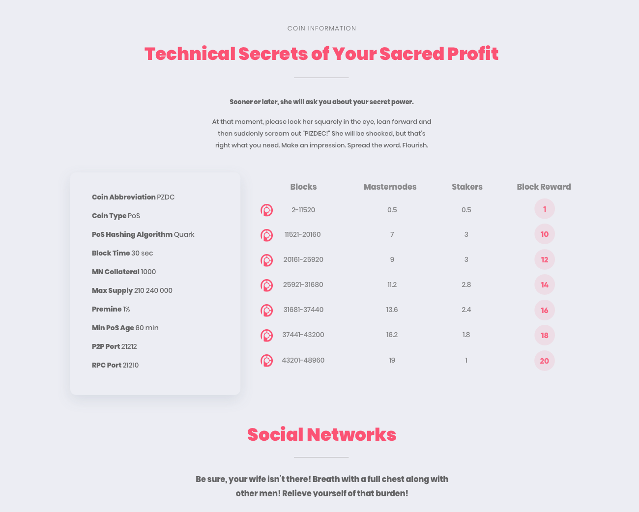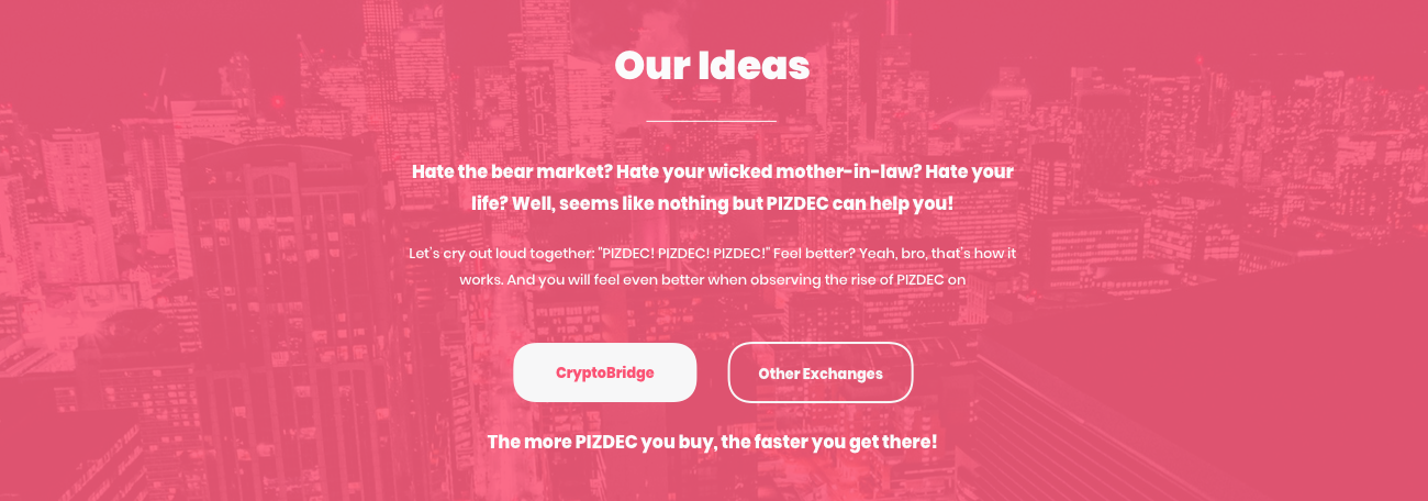 Lokoloko Posted 16 Jun 2018, 07:06 Posted 16 Jun 2018, 07:06 Описание идеи вообще огонь! Hate the bear market? Hate your wicked mother-in-law? Hate your life? Well, seems like nothing but PIZDEC can help you! Let’s cry out loud together: "PIZDEC! PIZDEC! PIZDEC!" Feel better? Yeah, bro, that’s how it works. And you will feel even better when observing the rise of PIZDEC on 1