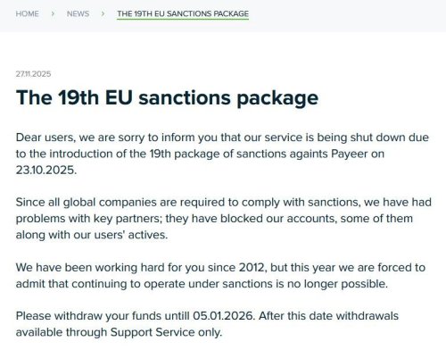 Служба по расследованию финансовых преступлений Литвы (FNTT) оштрафовала компанию Payeer, которая предоставляла услуги депозитарного оператора цифровых активов и центра обмена виртуальных валют, за нарушение международных санкций. FNTT наложила на компанию Payeer штраф в размере 9,29 млн евро ($10 млн). Правительственное агентство установило, что литовская компания Payeer могла быть преемницей фирмы Payeer, ранее зарегистрированной в Эстонии, и лишившейся своей лицензии на осуществление дея -