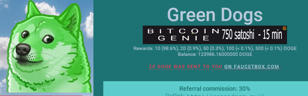 Fialka Posted 22 Aug 2015, 13:26 Posted 22 Aug 2015, 13:26 (edited) Свежий краник догов раздаёт \10 (98.6%), 20 (0.9%), 50 (0.3%), 100 (< 0.1%), 500 (< 0.1%) DOGE каждый час сразу на FaucetBOX ;) ссылка - http://greendogs.ru/?r=DSyT8vDeJRPLqBcudrcponWKNDjVp4zEtH Партнёрка - 30% Edited 22 Aug 2015, 14:29 by Fialka