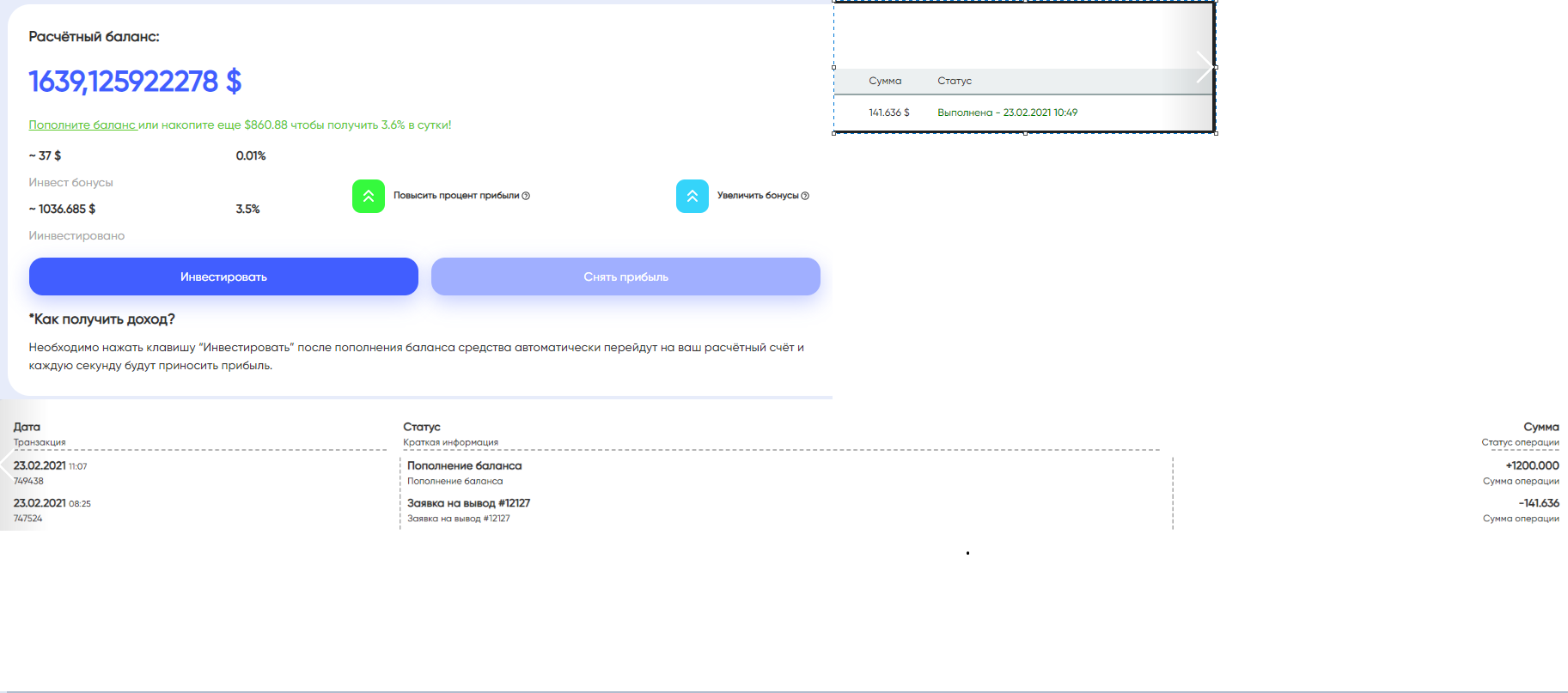 grand7 Posted 8 Jan 2021, 17:23 Posted 8 Jan 2021, 17:23 30$ бонус при регистрации! После регистрации получаете еще 6$ (по 3$ за каждое действие) дополнительно подписываетесь в вк и телеграммПрибыль поступает каждую секунду!Стабильный доход в 3% каждый деньВозможность зарабатывать без вложений! Минимальная сумма для вывода — 1 $ https://uranium.cash