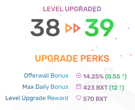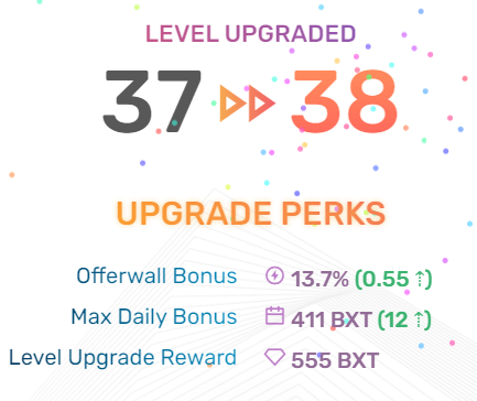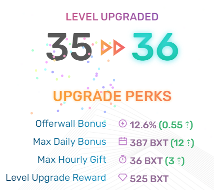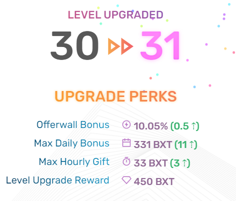meow08 Posted 15 Feb 2021, 19:50 Posted 15 Feb 2021, 19:50 (edited) BXT - это токен сайта, 10000 BXT равны 1$. Есть система уровней, с повышением уровня увеличивается верхний предел возможной почасовой выплаты, а также увеличивается бонус за предложения (офферы). Также есть разовые награды за достижение каждого уровня. Есть бонус лояльности, который увеличивается каждый день на 3 BXT, вплоть до 300 BXT (при ежедневном его получении). Есть дневные и пожизненные достижения за выполнение различных задач. https://bucksify.com/?ref=qx20881 Минимальный вывод от 50000 BXT на кошельки LTC, DOGE, DGB, TRX, ZEC, DASH; от 75000 BXT в BTC и от 300000 BXT в ETH. Также можно тратить заработанное на покупку подарочных карт. Выплата: Edited 20 Jun 2021, 05:06 by meow08