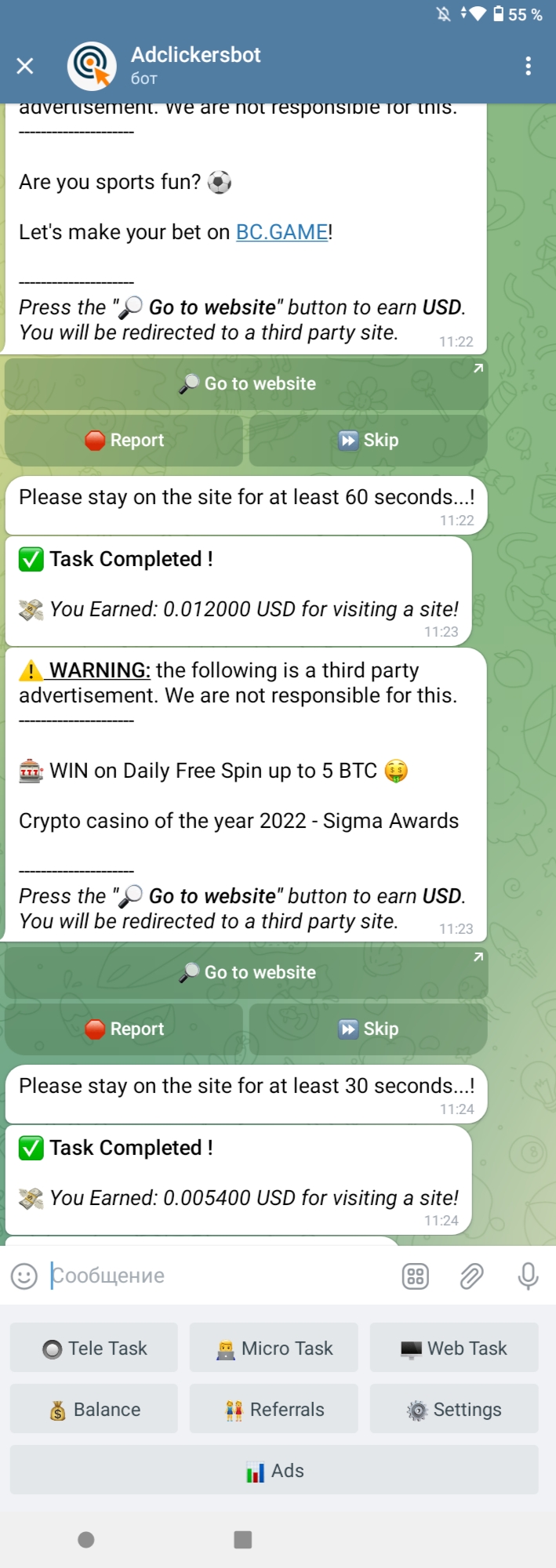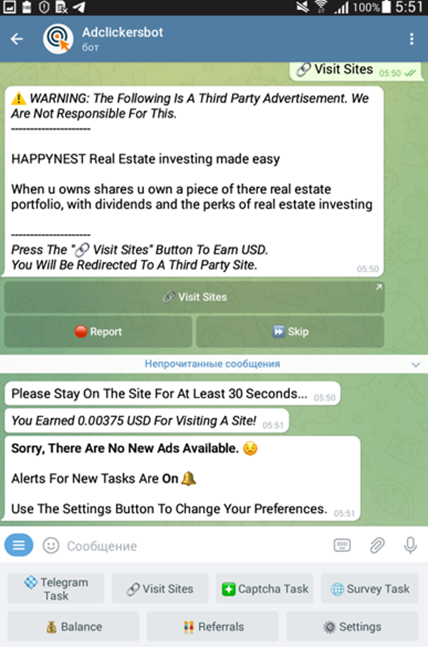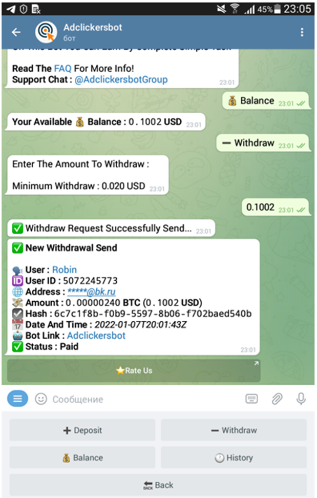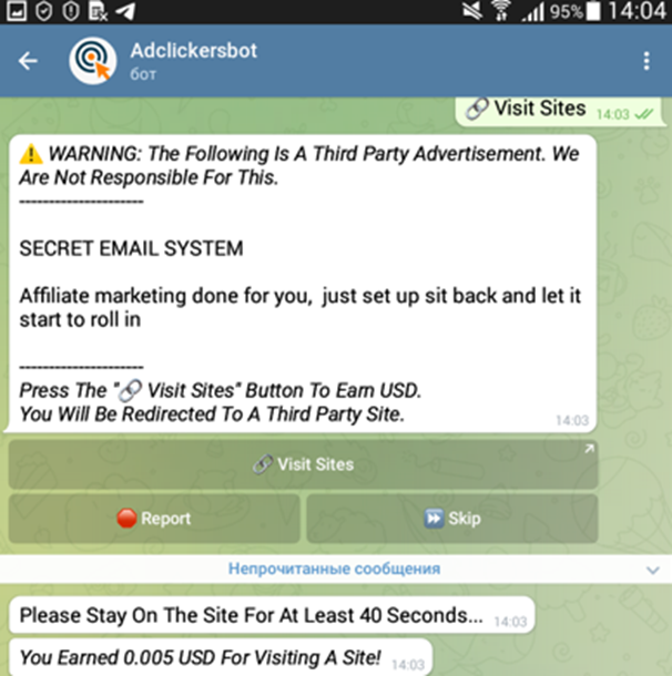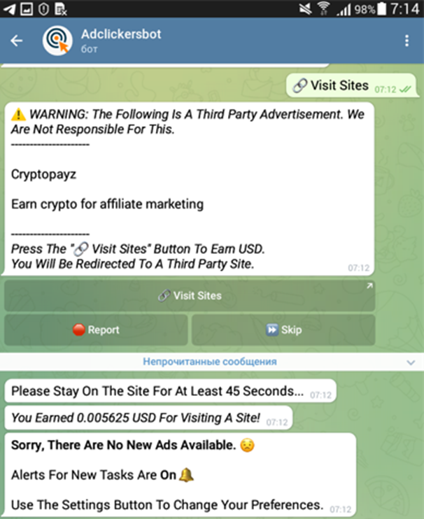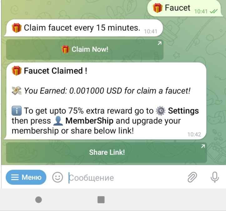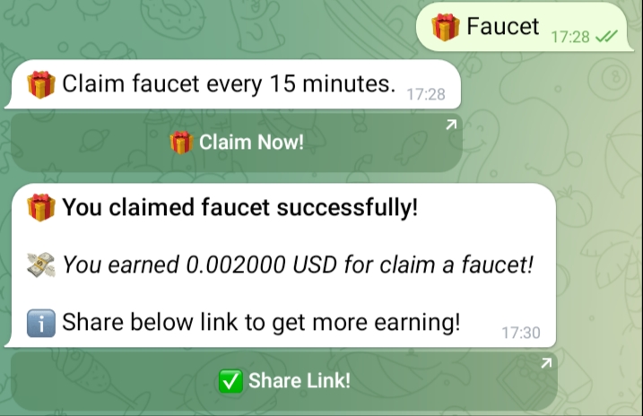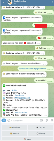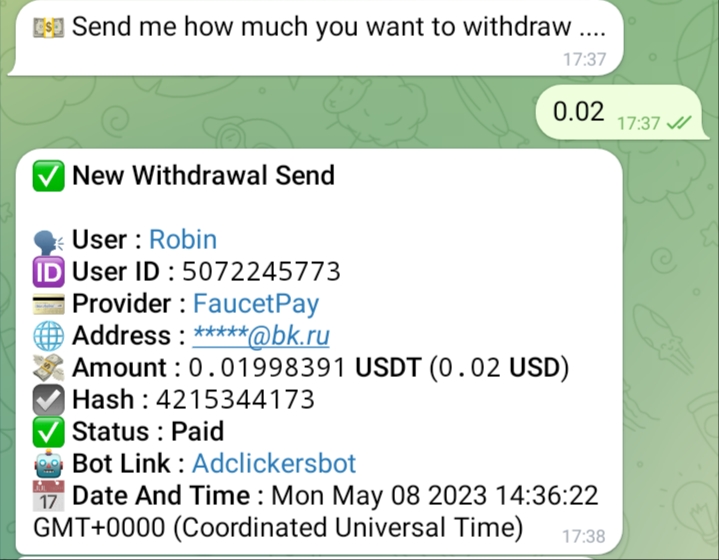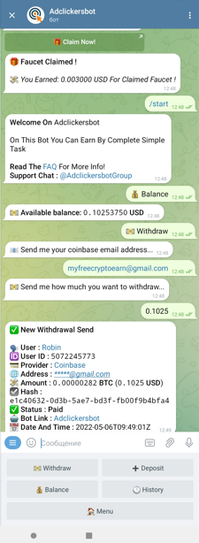 t.me/adclickersbot-Telegram Bot - 0.002$ faucet/15 min (visit sites, view posts, join chats, captcha task и др. задания), вывод на FaucetPay от 0.02$