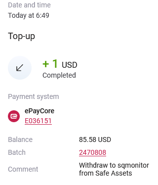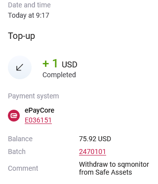 SQMonitor Posted 9 Jul 2022, 08:39 Posted 9 Jul 2022, 08:39 Perfect Money: 08.07.22 07:24 Receive Received Payment 4.9 USD from account U12456834 to account U38338228. Batch: 471762351.