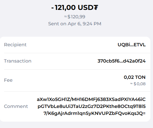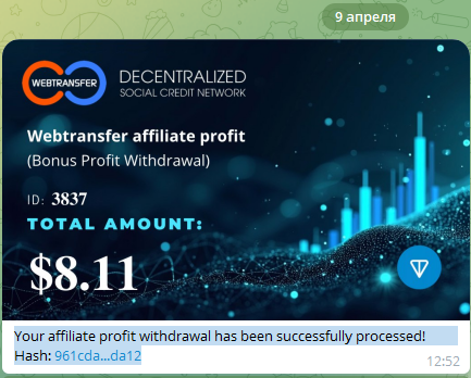 Butcher139 Posted 9 Apr 2025, 18:26 Author Posted 9 Apr 2025, 18:26 Выплата $8.11 Your affiliate profit withdrawal has been successfully processed! Hash: 961cda...da12 (https://tonviewer.com/transaction/96...ac79117914da12)