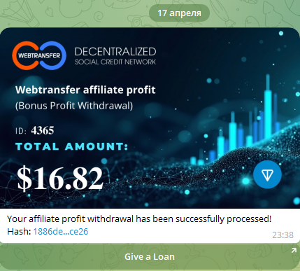 Butcher139 Posted 11 Apr 2025, 14:15 Author Posted 11 Apr 2025, 14:15 🌟 Какой доход Вы получаете за приглашение новых партнёров в Webtransfer? 🌟 💼 Бонус за регистрацию: При регистрации на платформе вы получаете моментальный бонус в размере $50! 🎉 🤝 Бонус за приглашение новых партнёров: Каждый новый партнёр в вашей сети (до 5 уровней глубины) также получает подарок — $50 на старт! (только тогда, когда привлеченные выдадут свои бонусы в займ) Это расширяет ваши возможности и делает вас частью мощного сообщества. 📈 💰 Ваш реферальный бонус: Как только приглашенный Вами партнер отправит в займ $50 бонусных. Вы получаете $50 вознаграждения. Чем больше людей вы привлечёте, тем больше возможностей для заработка! 🌍 📊 Дополнительный доход: Когда ваши младшие партнёры начнут использовать свои бонусные средства для выдачи займов, вы сможете заработать процент от их реальной прибыли: - 20% с первого уровня (ваши личные партнёры) - 10% со второго уровня (партнёры ваших партнёров) - 5% с третьего уровня (партнёры партнёров второго уровня) - 3% с четвёртого уровня (партнёры партнёров третьего уровня) - 3% с пятого уровня (партнёры партнёров четвёртого уровня) 🎯 В итоге: Вы и ваши партнёры получаете не только бонусы при регистрации, но и стабильный доход от успешных займов ваших рефералов. Присоединяйтесь к Webtransfer и начинайте зарабатывать уже сегодня! 💸✨