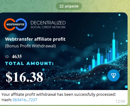 Butcher139 Posted 7 Apr 2025, 21:04 Posted 7 Apr 2025, 21:04 (edited) Тема создана для ознакомления и не является призывом к каким-либо действиям. Вся ответственность за сохранность ваших денег лежит только на вас. Я не несу ответственности за ваши решения! Я не админ / владелец сайта Старт проекта: 20.06.2024 О проекте: Webtransfer — это инновационная платформа для p2p крипто-кредитования, которая объединяет заемщиков и кредиторов. Мы предоставляем возможность каждому пользователю получить займ или заработать выдавая займы другим участникам. Также мы предлагаем различные бонусные программы и партнерские возможности. Инвестиционные планы: до 1% в день как на 1 день, так и на длинные сроки (можно самому выбирать) Возврат вклада: В конце Начисление: Календарные дни Минимальный вклад: $10 USDT или 1 TON. Для депозита необходимо подключить свой тон кошелек к приложению в Телеграме, на него же будет автоматически происходить возврат средств. Платежные системы: USDT | TON Минимальная Выплата: 1 USDT Выплаты: в течение 24 часов Реф-программа: Зарабатывайте проценты от доходов ваших партнеров. Кроме бонусов за приглашения, вы также зарабатываете от доходов, полученных вашими партнерами. Ваш доход зависит от ваших личных вложений (P2P и оптовых займов) и общего объема вложений вашей команды. • Процент от дохода партнера автоматически зачисляется после закрытия кредитов младших партнеров • Заработанная прибыль доступна для немедленного вывода • Заявки на вывод обрабатываются в течение 24 часов Уровень % от дохода партнёров Личные вложения Командные вложения 1 20% $10 – $500 <$1,000 2 10% $501 – $1,000 $5,000 – $10,000 3 5% $1,001 – $2,000 $10,000 – $15,000 4 3% $2,001 – $3,000 $15,001 – $30,000 5 3% >$3,000 $30,000 Итого: 41% от дохода партнеров Зарегистрироваться Депозит:https://prnt.sc/Etnu4UXDD5DE https://tonviewer.com/transaction/37...6041d3d42a0f24 Edited 24 Apr 2025, 08:42 by Butcher139