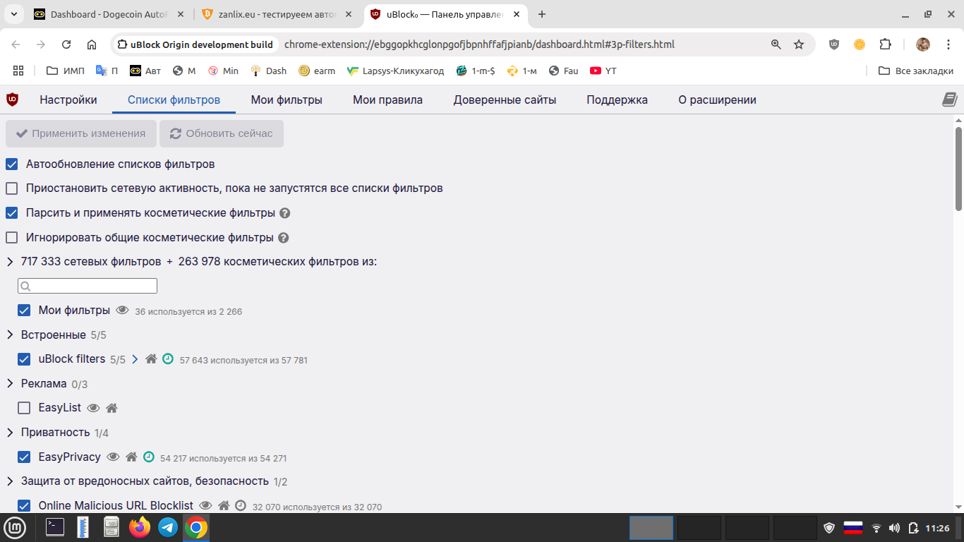 Dedgorun Posted 18 Jul 2025, 08:27 Author Posted 18 Jul 2025, 08:27 35 минут назад, videomig сказал: про фильтры не понял где он .без него оплата пришла автоматически Настройки UBO - Списки фильтров - отключить EasyList