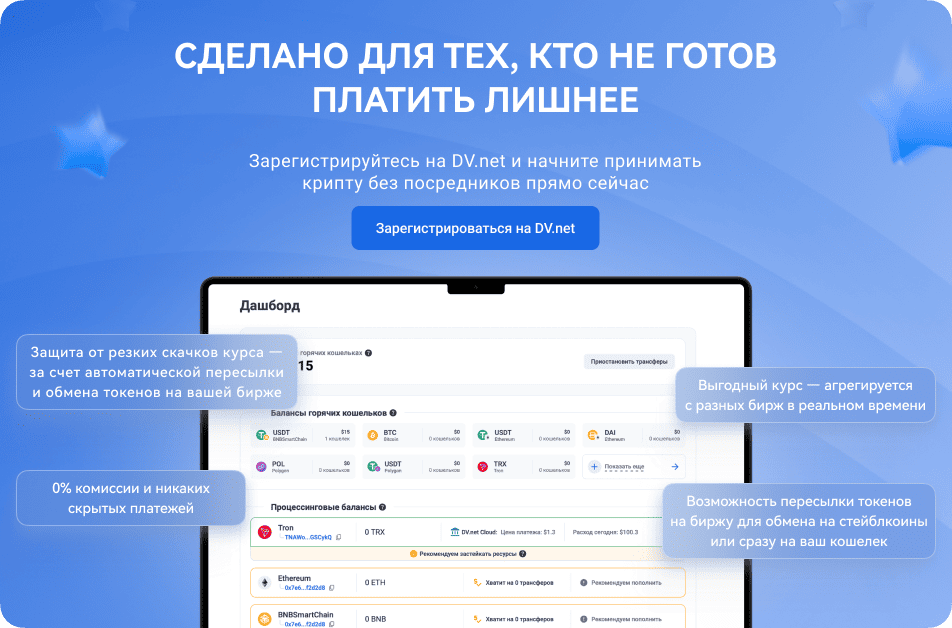 Подключение криптовалютного эквайринга DV.net DV.net — криптоэквайринг нового уровня: без комиссий и посредников DV.net — это полностью некастодиальное решение: мы не храним средства и не имеем доступа к вашим кошелькам. Только Вы управляете своими активами, а мы лишь предоставляем доступ к нодам и блокчейн-эксплорерам. Благодаря этому подходу мы: Отказываемся от комиссий с оборота и скрытых платежей; Сохраняем гибкость тарифов — платите только за реальную актив -