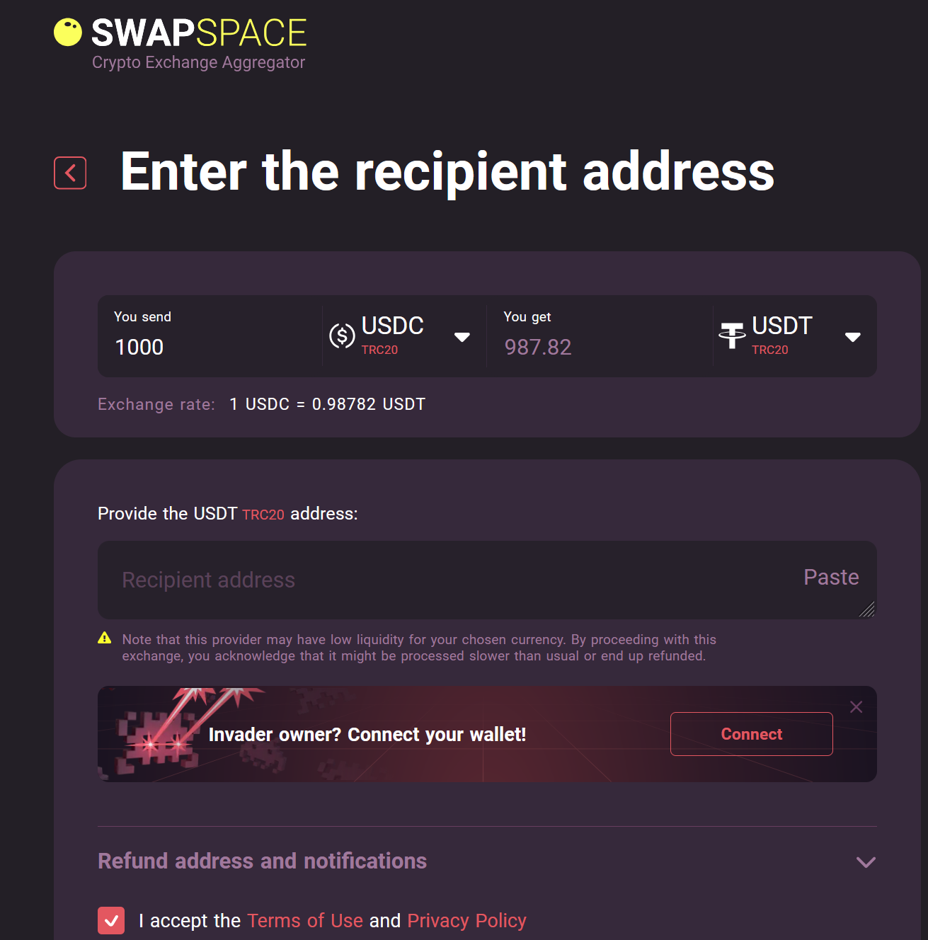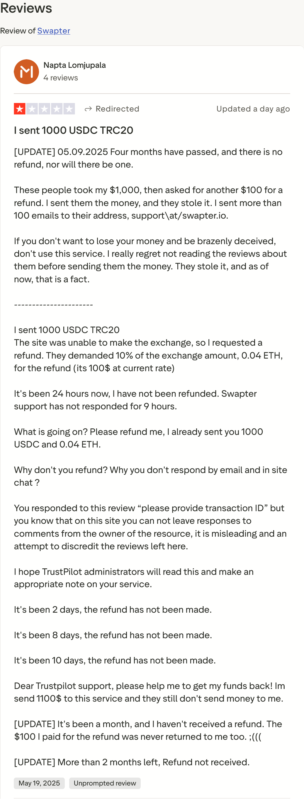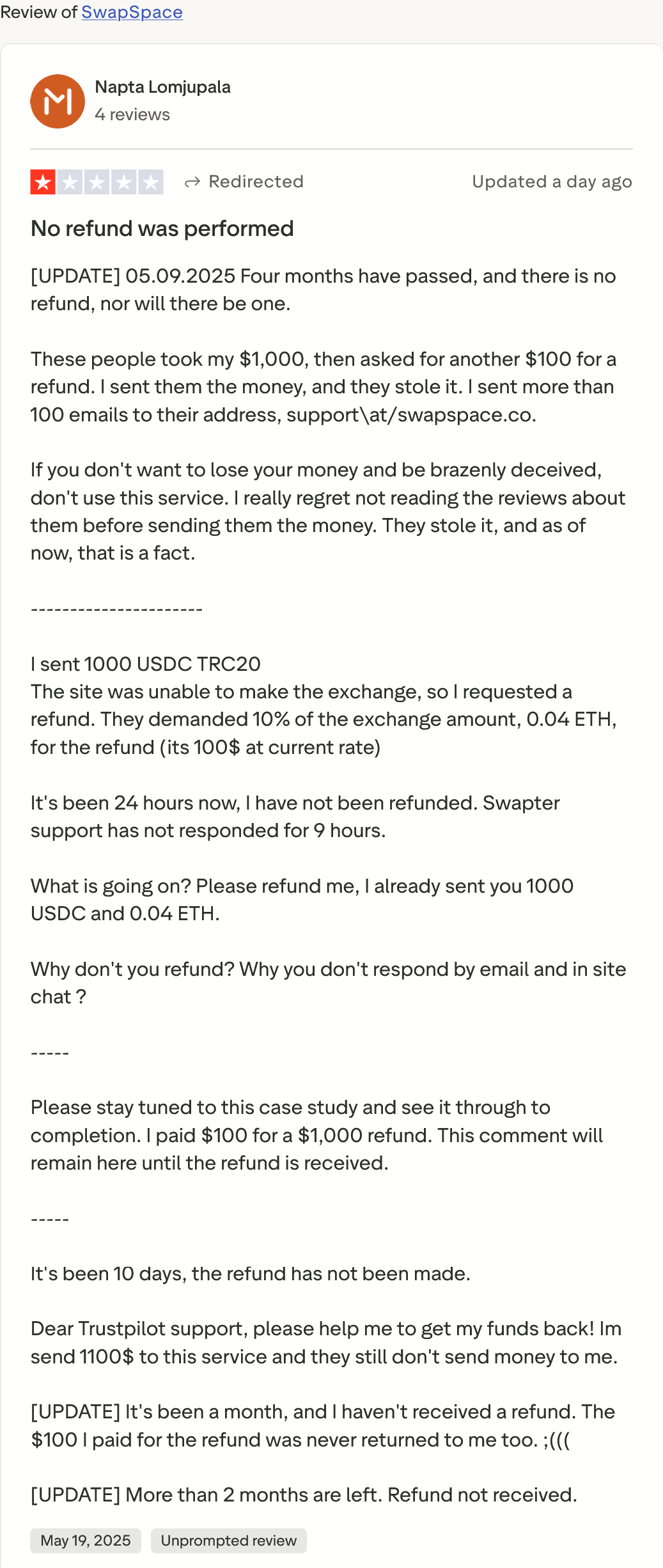 Обменник Swapter и агрегатор SwapSpace не вернули 1100$. Это кража, других слов нет