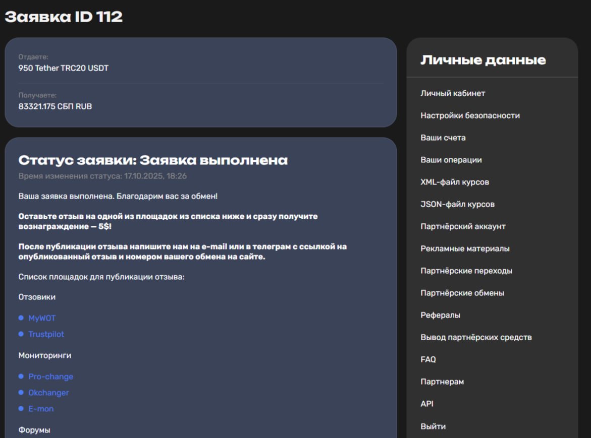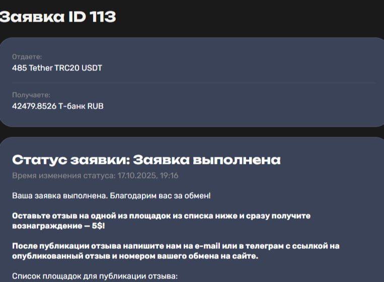 Толя Буряченко Posted 18 Oct 2025, 12:15 Posted 18 Oct 2025, 12:15 Пользуюсь этим обменником уже несколько раз и всегда остаюсь довольным. Обмен прошёл быстро — в течение 10 минут средства уже были на моем счете. Курс обмена действительно выгодный, не хуже, чем у крупных платформ.