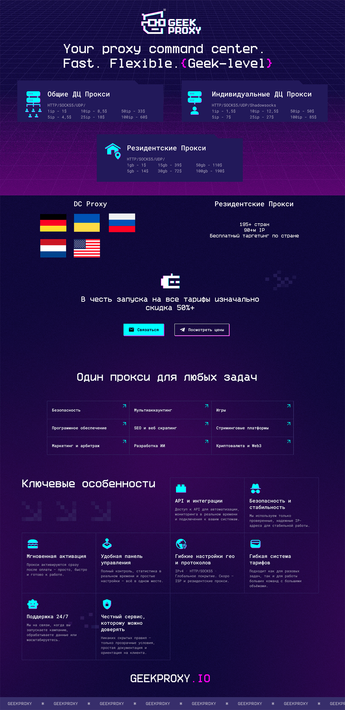 [GEEKPROXY.IO] — Приватные IPv4 (от 1$) и Резидентские прокси(190 ГЕО) | Udp/Http/Socks5/Ss | Тест за отзыв